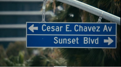 And then we slowly ascend upward, GOING HIGHER AND HIGHER until the city SPREADS OUT BEFORE US: A GIANT MAP . . . In the bottom corner of this image, the words, “Welcome to Los Angeles” are slowly scratched out and replaced by “Bienvenido Al Pueblo de Nuestra Senora, La Riena de LOS ANGELES” . . . (103)