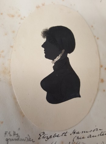 The Butler Harrisons had ten children, who all lived to adulthood. Silhouettes of Elizabeth, John, and their children were in the collection of their great-grand-daughter Helena Austen Harrison, which was donated to the Southampton Archives. The image of Elizabeth Matilda, Jane Austen’s goddaughter, was prominently displayed in the exhibition. In 1814 Elizabeth Matilda married her cousin the Reverend William Austen in St. Mary’s Church, Southampton. Jane’s mother wrote to her granddaughter Anna Lefroy about the generous distribution of Bride-Cake (Govas 35). The couple traveled into Sussex, where William was the incumbent of Horsted Keynes.