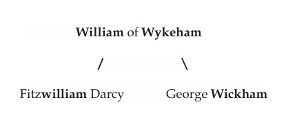 Though the tag Fitz within a name originally had the simple meaning of son (as when applied to John d’Arcy le Fitz in the fourteenth century), by Austen’s time it had undergone semantic change to become a prefix indicating illegitimacy. I believe Austen uses this contrast between Elizabeth’s two suitors to indicate that Darcy, though a Fitzwilliam, is free from any suggestion of “illegitimacy”: of these two Williams, Collins and Darcy, the former conspicuously lacks Bishop Wykeham’s Christian charity, while the latter displays sufficient charity and largesse to be deemed Wykeham’s true and legitimate heir.