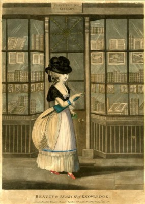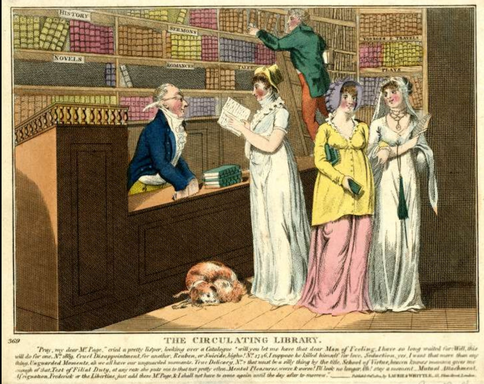 Circulating libraries get a mention in several of Austen’s novels. Both Mr. Collins in Pride and Prejudice and silly Sir Edward Denham in the unfinished novel Sanditon take a dim view of them, with Sir Edward declaring, “‘I am no indiscriminate novel-reader. The mere trash of the common circulating library, I hold in the highest contempt’” (LM 181). But for thoughtful Fanny Price, banished from Mansfield Park to her lowly Portsmouth origins, the circulating library provides solace and agency: “wealth is luxurious and daring—and some of hers found its way to a circulating library. She became a subscriber—amazed at being any thing in propria persona, amazed at her own doings in every way; to be a renter, a chuser of books!” (MP 461).