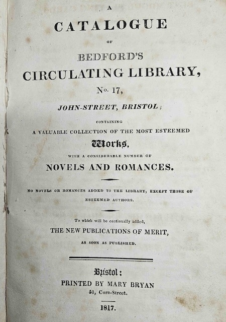 A Catalogue of Bedford’s Circulating Library (Bristol: Mary Bryan, 1817). Chawton House, Acc. No. 1623. |