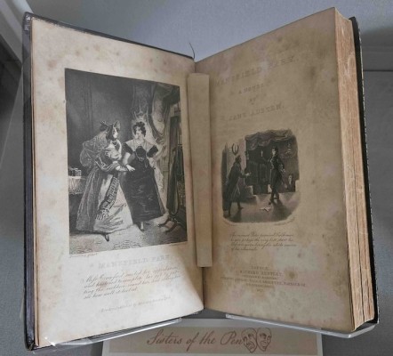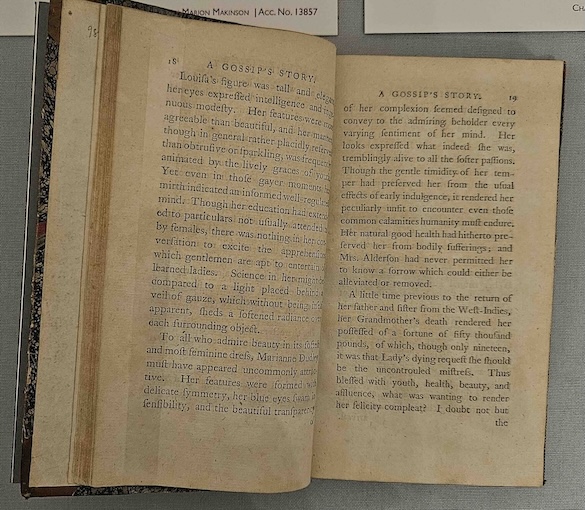 This copy of A Gossip’s Story is open at West’s description of sisters Louisa and Marianne, who bear similarities to Austen’s Elinor and Marianne. Austen clearly knew West’s work, writing admiringly of her capacity to write despite “all her family cares” (8–9 September 1816). In an earlier letter to her niece Anna, she is more comically dismissive: “I think I can be stout against any thing written by Mrs West (28 September 1814). Mrs West's last novel, Ringrove; or, Old-Fashioned Notions (1827), bears similarities to Austen’s Emma.