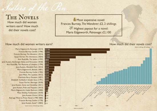 Our infographic on women’s novels gives a sense of how much purchasers were expected to pay for novels, but also how much women writers earned. While Maria Edgeworth, Frances Burney, and Ann Radcliffe made more than enough to live on, a career as a writer was not a feasible financial option for many women writers, with Minerva Press novelists earning around £30 per novel. Jane Austen is at the bottom, with a payment of just £10 for the early version of Northanger Abbey, Susan, which the publisher failed to release. Also low on the list is Mary Shelley’s Frankenstein, despite its being the most frequently adapted novel by a woman from this period.