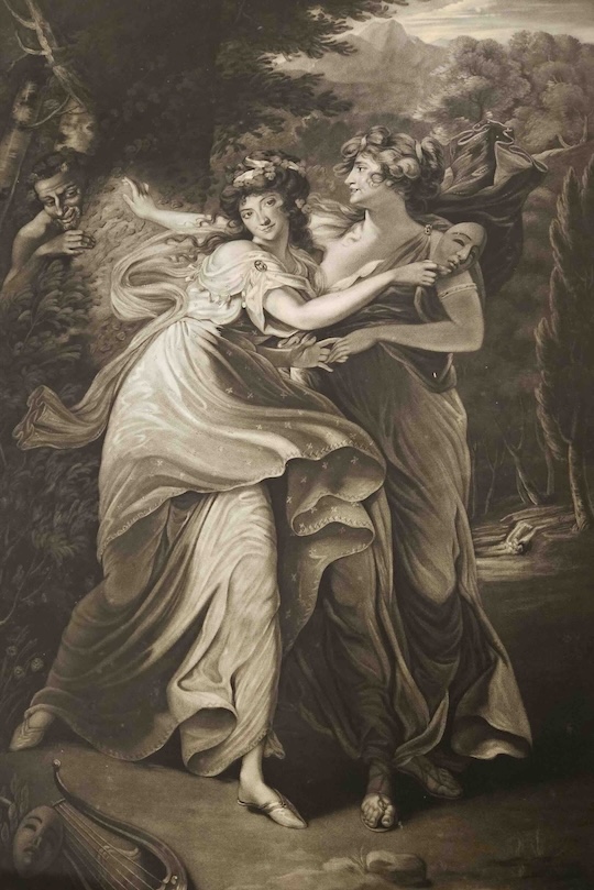 Mrs. Jordan in the Character of the Comic Muse; supported by Euphrosyne, who represses the Advances of a Satyr (1787), by T. Park, after John Hoppner. Chawton House, Deirdre Le Faye Archive DLF/P/001. |