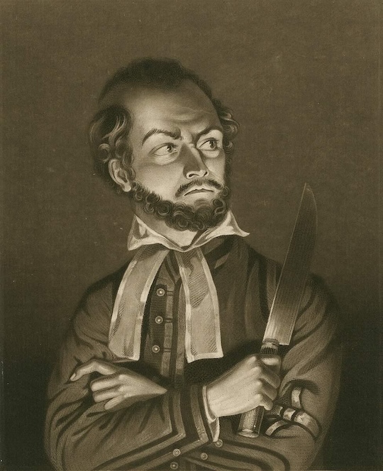 Edmund Kean as Shylock from the Merchant of Venice, by Henry Meyer, engraved from a painting by Walter Henry Watts (mid-1810s). (Click here to see a larger version.)