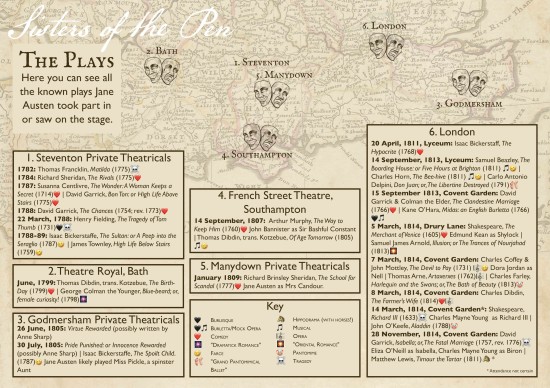 Our infographic on Jane Austen and the stage gathers all the plays that we know Jane Austen performed in for amateur theatricals or saw on the professional stage. It is necessarily incomplete, pieced together from remaining letters or the accounts of relatives such as her niece Fanny, but it gives a sense of Austen’s knowledge of the stage and the variety of performances she attended, from pantomime to tragedy.