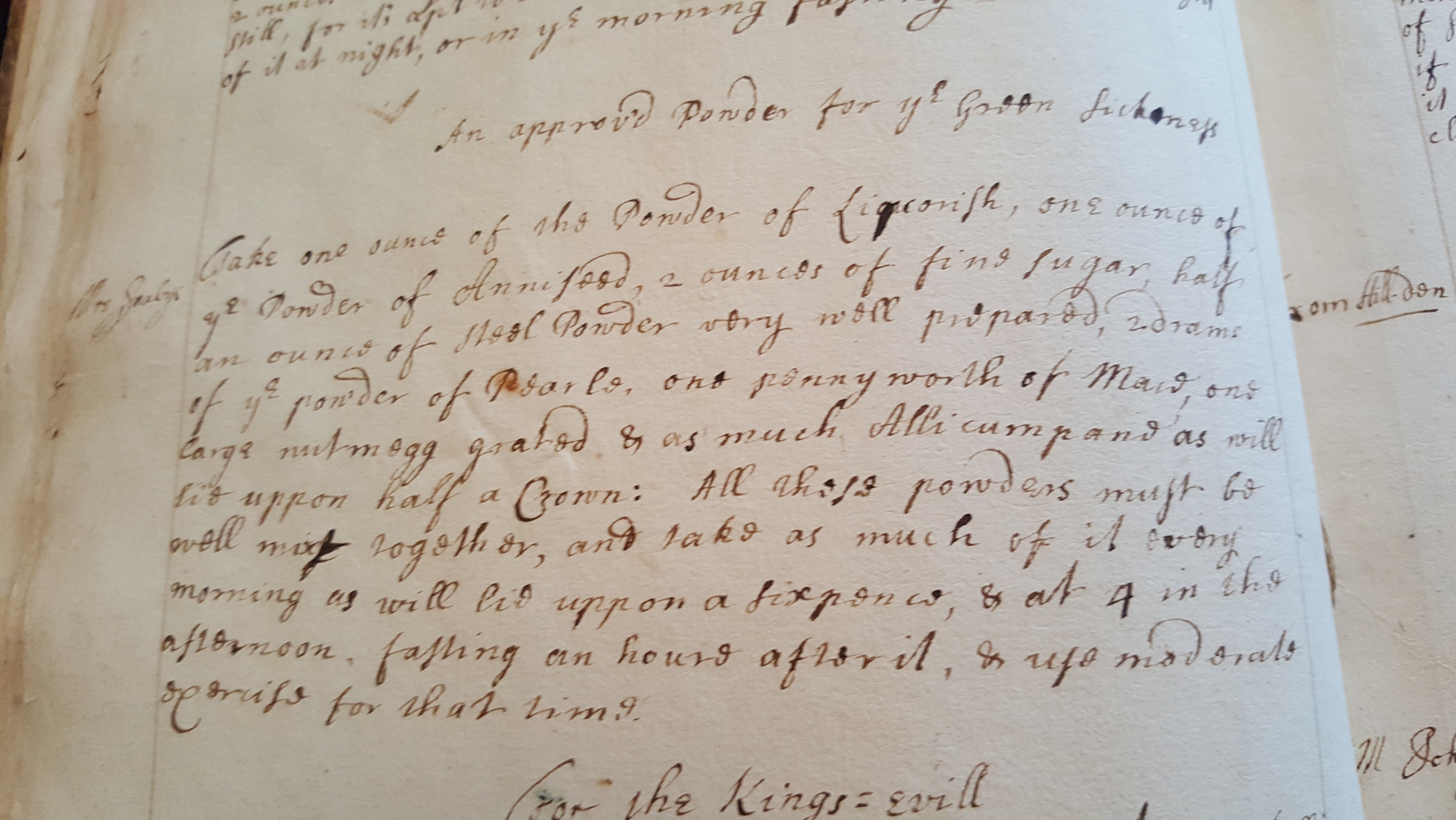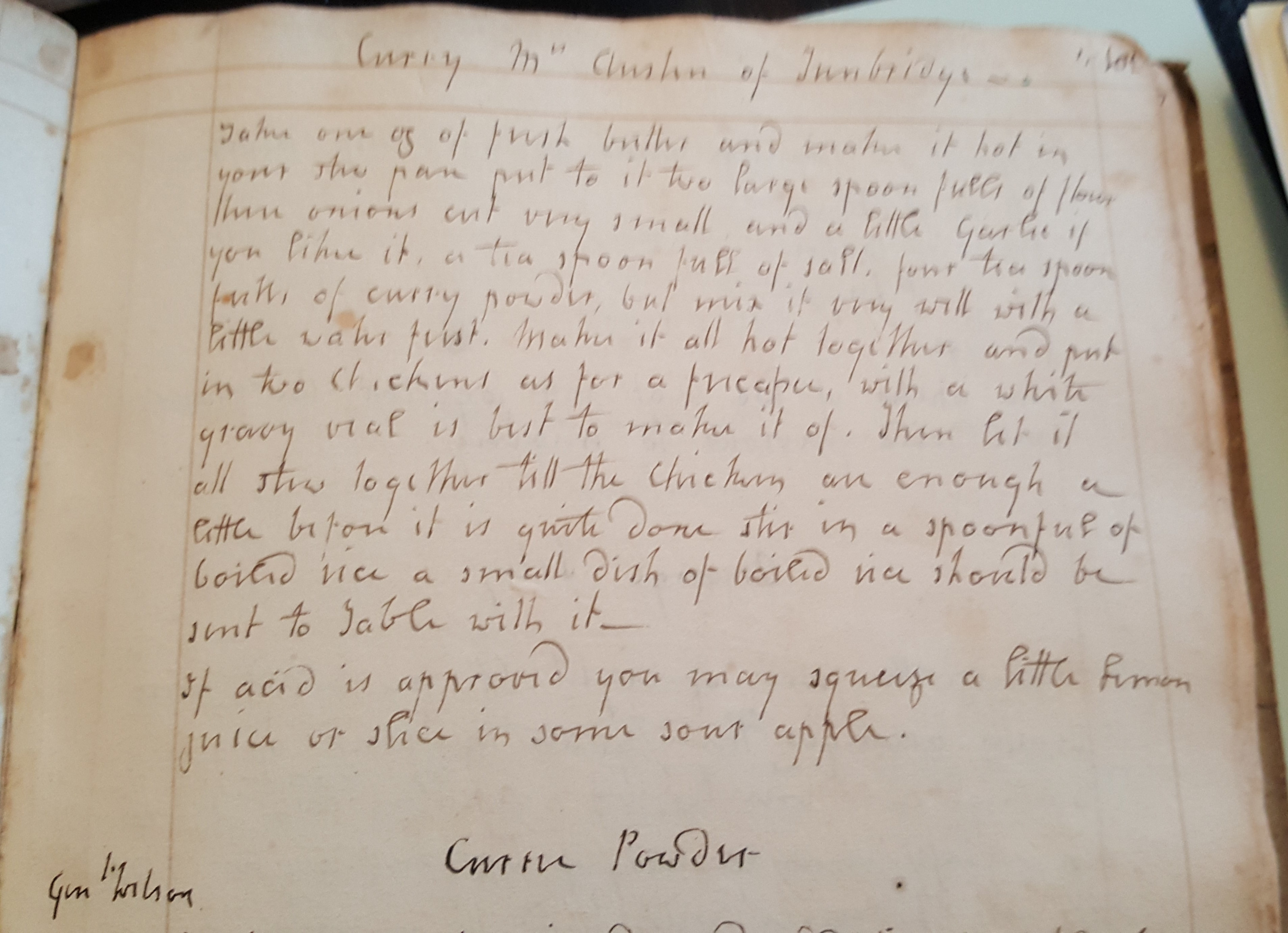 Elizabeth’s household book contains over 205 entries, many very clearly written. Topics range from the culinary to the medicinal; household items include a cosmetic recipe for coloring red or grey hair. Medical recipes include one for palsey water, which was either drunk or bathed in, and a recipe that does not specify its medical use but that should be taken at the “change and flush” of the moon. Some recipes call for unusual ingredients: one begins, “Take Dragons.” There are also recipes for “stump pye.” Household hints include a liquor for boots and shoes, mahogany coloring for furniture, and a cleaning product for grates, plus information on making ink and poison and dyeing gauze. There are several recipes for the bite of a mad dog—in fact, a cure for dog bites was a major promotion by the watering place of Southampton. Many recipes show the influences of colonization and empire. There are recipes for sugar cakes (sugar being a major import from the West Indian plantations), Portingall cake, curries, and punches made fashionable thanks to the East India Company.
