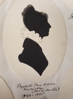 The Butler Harrisons had ten children, who all lived to adulthood. Silhouettes of Elizabeth, John, and their children were in the collection of their great-grand-daughter Helena Austen Harrison, which was donated to the Southampton Archives. The image of Elizabeth Matilda, Jane Austen’s goddaughter, was prominently displayed in the exhibition. In 1814 Elizabeth Matilda married her cousin the Reverend William Austen in St. Mary’s Church, Southampton. Jane’s mother wrote to her granddaughter Anna Lefroy about the generous distribution of Bride-Cake (Govas 35). The couple traveled into Sussex, where William was the incumbent of Horsted Keynes.