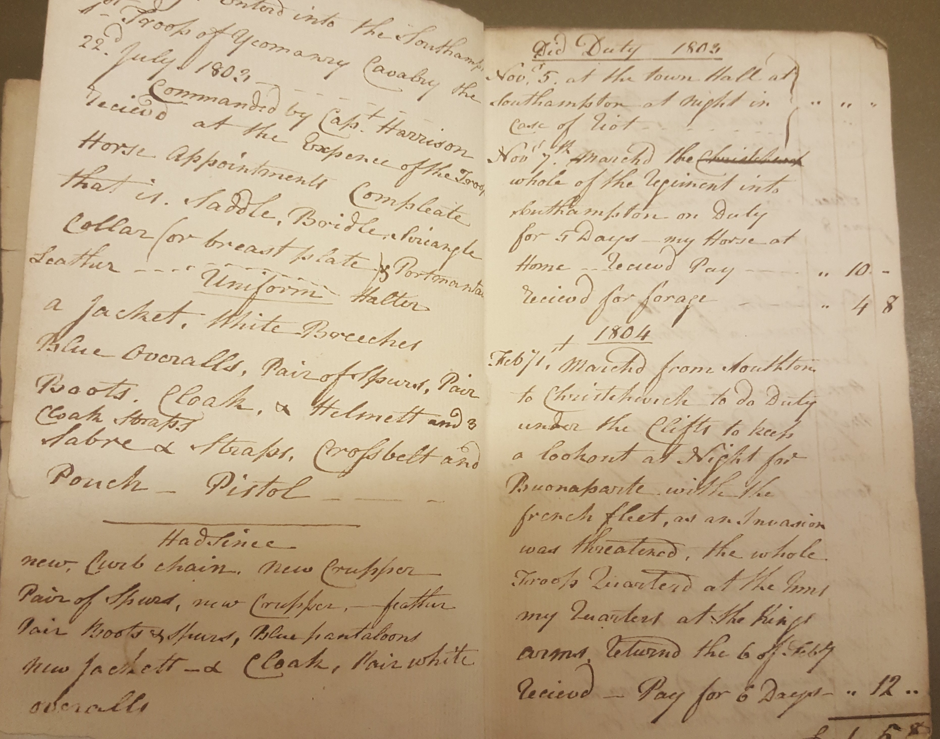 Sturdy’s journal records troop reviews, exercises, and drills. In December 1803 almost 2,000 local volunteers were reviewed on Shirely Common by the Duke of Cumberland, Prince Ernest Augustus, fifth son of George III and later King of Hanover. As fears of invasion grew, the next spring saw an exercise in which volunteers from Southampton and other areas staged a mock attack on Peartree Green from the River Itchen. In February 1804, as concerns about a French invasion grew, Sturdy’s troop spent six days in Christchurch keeping a lookout for the French fleet before returning to Southampton. They undertook drills in South Stoneham, Redbridge, Nursling, and Millbrook. Late in December 1804 Napoleon Bonaparte was crowned Emperor, so the troops marched with a fife to St. Lawrence Church, where the Reverend Mears, the troop chaplain, preached a sermon: “Put on the whole Armour of God that ye may be able to stand against the wiles of the Devil.” In 1805 on the 8th anniversary of the Yeoman Cavalry’s founding, a celebratory dinner for the officers was held at the Crown Inn on the High Street.