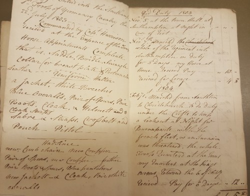 The journal begins in 1803, the year the militia was put back onto a wartime footing after a brief respite in the Napoleonic War following the Treaty of Amiens. The Loyal Southampton Fusiliers were under the command of Josias Jackson of Bellevue House, who had recently settled in the town. Josias Jackson was heir to five plantations on St. Vincent and had taken part in the Second Carib War (1795). In 1807 he became MP for the town and in 1812 made a speech in Parliament praising “the character of the West Indian planters,” who, he said, “in accomplishments and humanity were equal to the most polished society of England” (Thorne 3: 290).