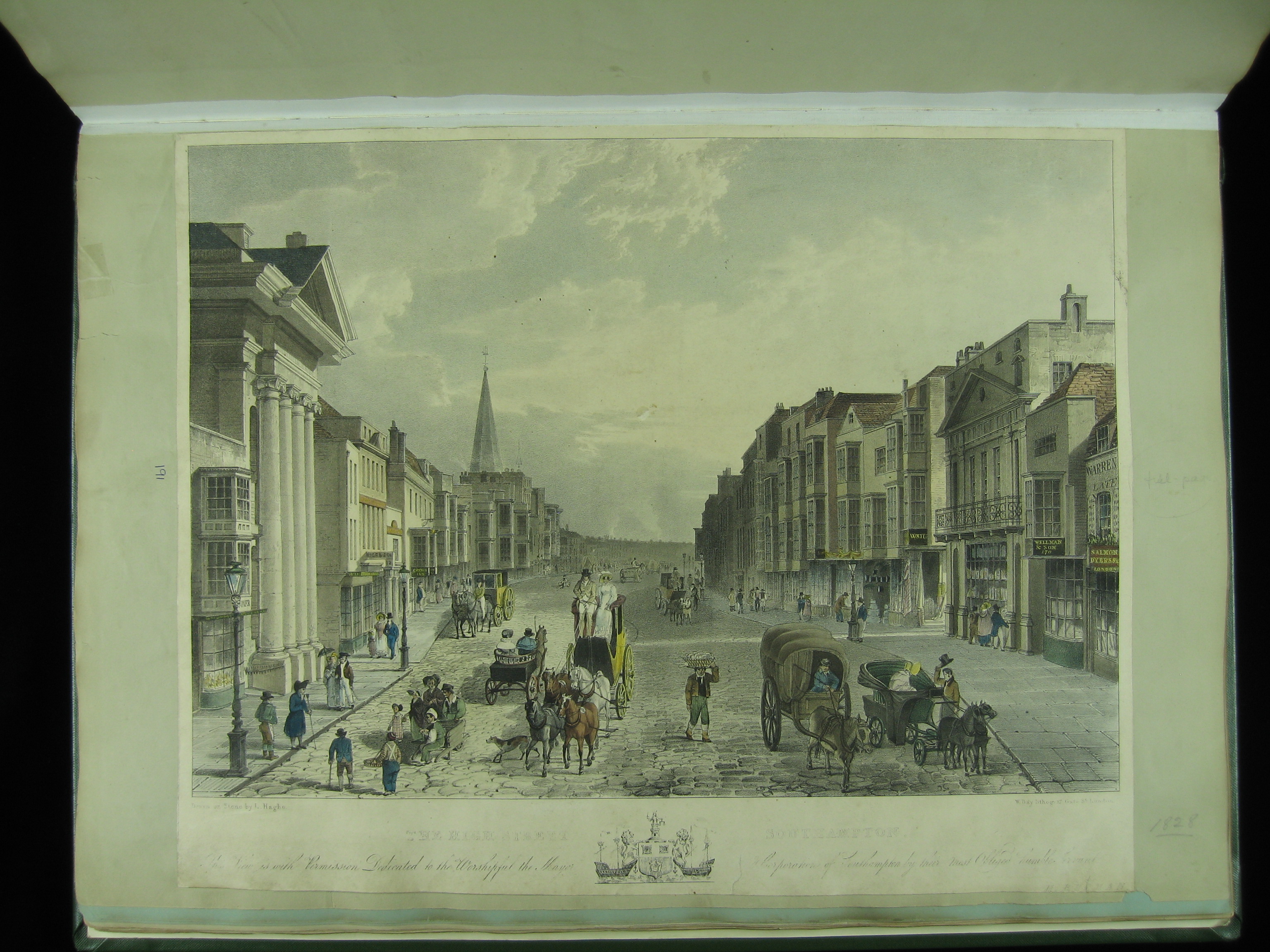 The exhibition opened with a display illustrating the Southampton of 1800, when 8,000 people were living largely within the town’s medieval walls. The town had reinvented itself as a watering-place around 1720, and by 1798 it was described as “elegant, well-built” with a “picturesque appearance” (Universal British Directory 461). Many of the medieval buildings had been given new frontages with sash windows; to others were added bow windows, pediments, and stuccoed exteriors. New facilities had developed to serve the growing number of visitors: a theatre, built in 1805, coffee houses, tea rooms, and circulating libraries such as those of the printers Thomas Baker and Thomas Skelton.