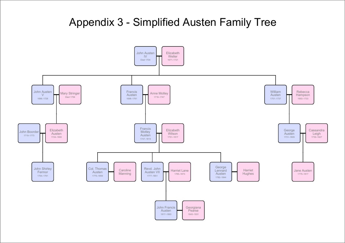 William’s letter is important for another reason. He mentions a “Jack Fermor,” whose mother Elizabeth is referenced in the primary sources as playing an important role in Francis’s household. William writes: “Jack Fermor had left Mr Austens the old man still seems hearty & I expect almost once more to have the pleasure of seeing him.” Le Faye notes this passage in her Chronology (105) but identifies neither William Kerril Amherst nor Jack Fermor. I believe that Jack Fermor is John Shirley Fermor (1754–91), the son of the Rev. John Fermor (1719–73), who was married to Elizabeth Austen (1724–1800). Elizabeth was the daughter of John Austen V (1696–1728) and therefore Francis’s niece (see Appendix 3). This relationship could explain why Francis drew up her marriage settlement (Hackworth 21). But their connection did not end there. After the death of Francis’s second wife in January 1782, Elizabeth kept house for her uncle Francis (Family Record 64), and he would leave her one hundred guineas in his will (Chronology 123).18 Elizabeth’s son, John Shirley, was therefore Francis’s great-nephew. Like Francis’s nephew George Austen, John Shirley attended Tonbridge School and won a Smythe exhibition, but he mostly lived in Sevenoaks (Hackworth 18, 34). At around the date of William’s letter, John Shirley would have been in his early thirties. William’s letter is also dated just over two years before Jane Austen, Cassandra, and their parents visited Francis at the Red House in July 1788. Presumably, they would at that time have met Elizabeth Austen Fermor, George Austen’s cousin.