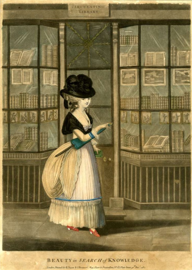 This print by Robert Laurie and James Whittle is based on an earlier watercolor by Isaac Cruikshank. Its satiric caption mocks the female frequenter of the circulating library as she scans the titles on offer: “Seduction, yes, I want that more than any thing. . . . School of Virtue, heaven knows mamma gives me enough of that.”
