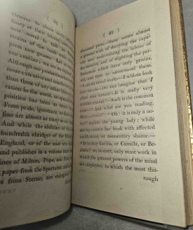 While circulating libraries did much to expand the readership of women writers, this expansion also generated more violent criticism alongside playful satire. Readers of Pride and Prejudice will recognize Fordyce’s Sermons to Young Women as the work with which Mr. Collins bores the Bennet girls, since “‘there can be nothing so advantageous to [ladies] as instruction’” (77). First published in 1766, the Sermons were widely read; the copy pictured here is the eighth edition. Fordyce represents an extreme version of eighteenth-century anxieties about the corrupting power of reading novels, claiming that few novels can be read by women with safety.