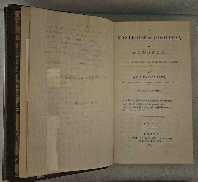 The Mysteries of Udolpho, by Ann Radcliffe (London: G. G. & J. Robinson, 1794). Chawton House, Acc. No. 602. (Click here to see a larger version.)