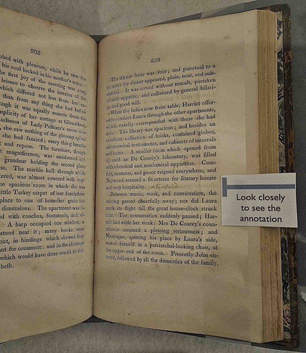 This copy of Self Control is the very one that Austen read while at Godmersham, her brother Edward Knight’s estate. Its heroine, Laura Montreville, spends the whole novel resisting the attentions of creepy Colonel Hargrave, who eventually abducts her. She then fakes her own death, escaping in a canoe. The family annotations dismiss passages as “foolish,” “dry,” and “stupid,” but we think this novel will please readers who like to see villainous libertines defeated by virtue.
