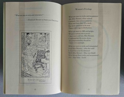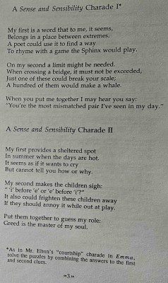 Two works, created by members of the Jane Austen Society of North America and published by local regions, went generically further afield. Patricia M. Shepherd’s book of poetry adapts famous lines from Austen’s six novels—such as “‘What are men to rocks and mountains?’” (PP 174)—into poems. In Austen’s Emma, a novel filled with misunderstandings and misreadings, riddles, charades, and word games work as motifs for codes and secrets. These charades were written by the Tennessee branch of the Jane Austen Society of North America. Can you solve them?